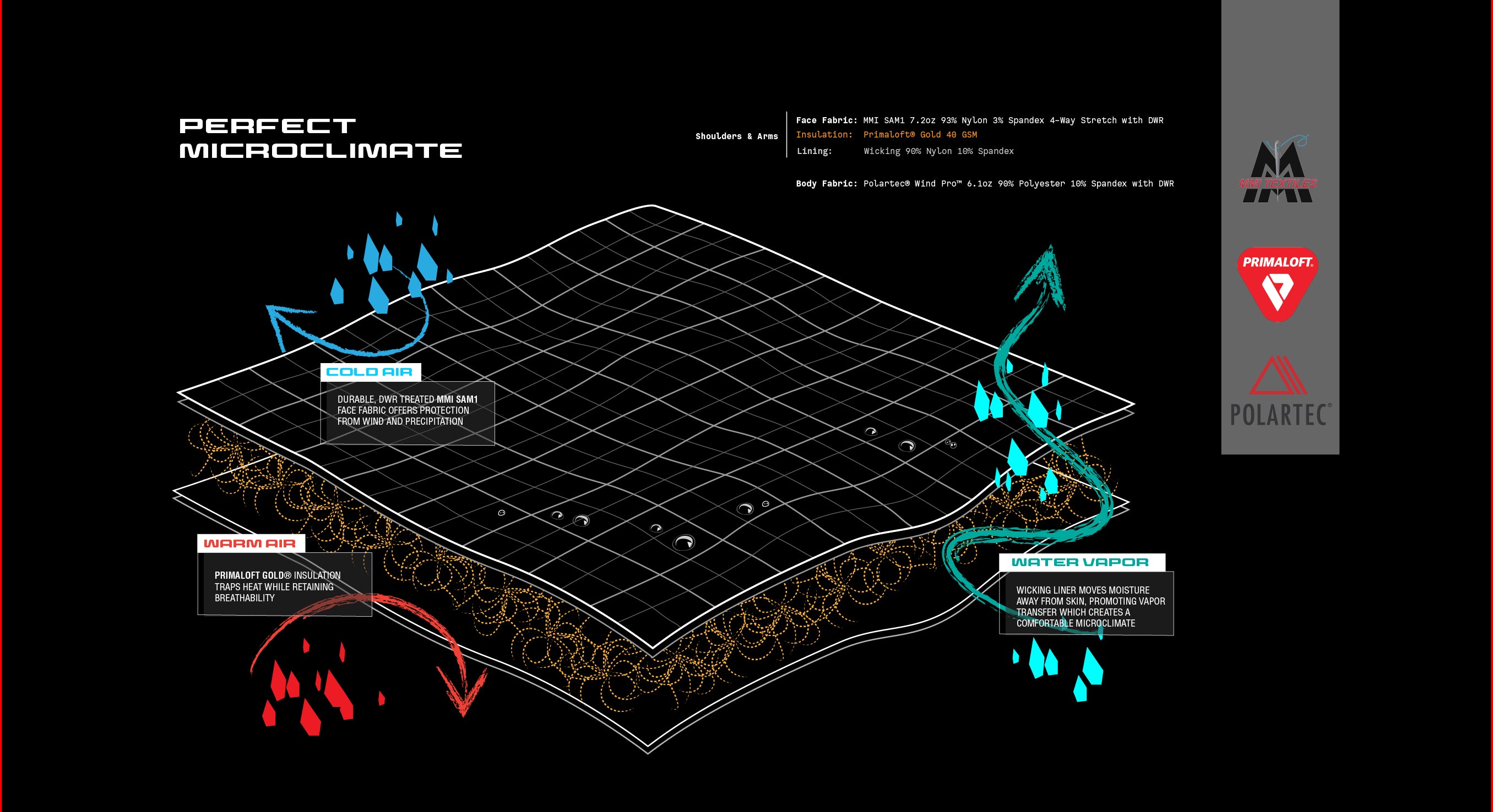 Durable, abrasion-resistant upper body fabric package provides protection from wind and precipitation while promoting vapor transfer and breathability. MMI SAM1 face fabric is DWR treated and Primaloft® Gold insulation provides warmth without bulk.