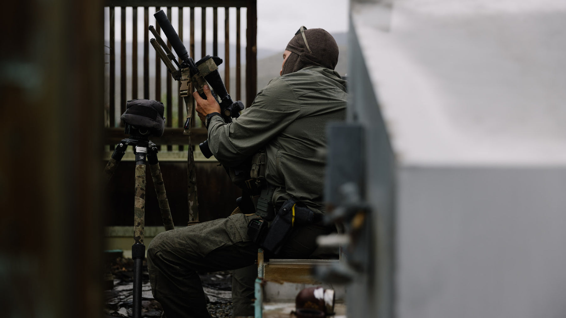 Quiet, featherweight, weather shedding and packable concealment for arctic, subarctic, or urban conditions that allows for kit access underneath.